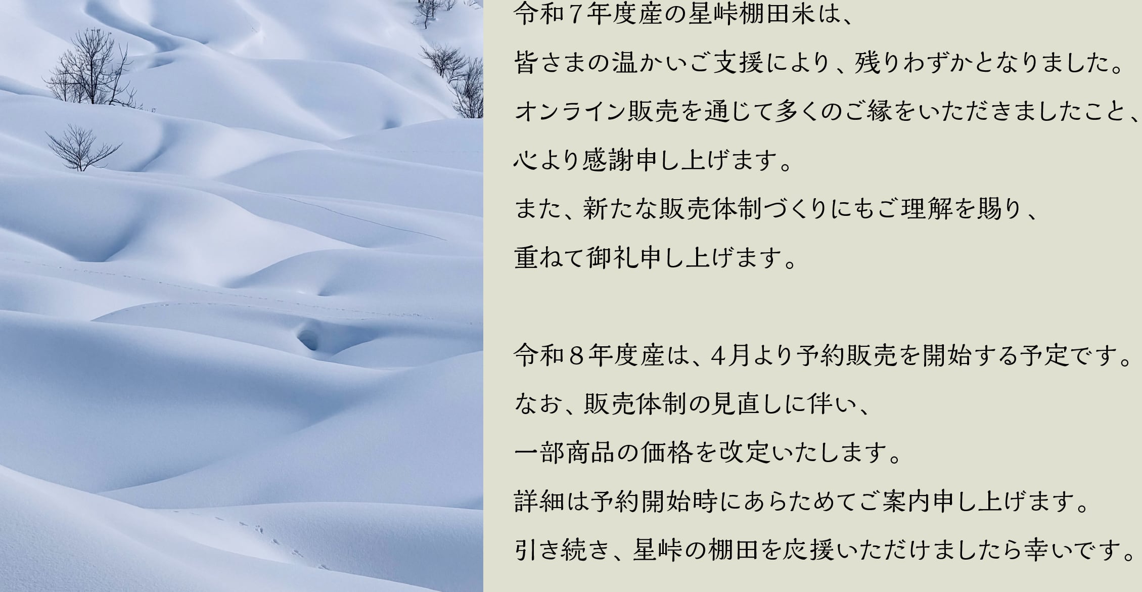 2013年に地元有志によって「星峠の棚田を守る会」が発足しました。そして2025年、新たな挑戦をはじめます。私たちが目指すのは、「守る」だけではなく、「未来へつなぐ」こと。耕作者の所得向上、移住者の受け入れ、関係人口の拡大など、新たな仕組みをつくり、多くの方々が棚田と関われる環境を整えてまいります。その第一歩は、お米に棚田保全費用を含ませていただくこと。耕作者が安心して農業を続けられる仕組みを築きます。ただし、それは単なる値上げではありません。棚田で手間をかけて育てた安心で安全な美味しいお米を、次世代までお届するための取り組みです。